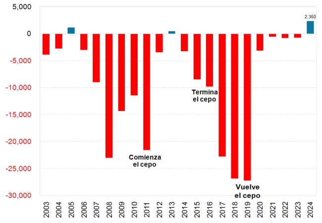 En el año 2023, la variación de reservas o resultado del balance de pagos fue negativo en casi –USD 22.000 millones. En el 2024 este resultado se revirtió en un resultado positivo de USD 6.000 millones. Lo interesante es observa la dinámica de esta reversión.